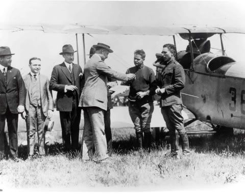 This photo shows Army airmail pilot Lt. Torrey Webb receiving a celebratory watch from a representative of the Hamilton Watch Company. Each of the pilots flying the first day's mail received a Hamilton Watch. Webb flew the Curtiss Jenny JN-4H between New York City and Bustleton airfield near Philadelphia on May 15, 1918.