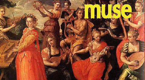 As a noun (in Classical Mythology), a muse is "any of a number of sister goddesses, originally given as Aoede (song), Melete (meditation), and Mneme (memory), but latterly and more commonly as the nine daughters of Zeus and Mnemosyne who presided over various arts: Calliope (epic poetry), Clio (history), Erato (lyric poetry), Euterpe (music), Melpomene (tragedy), Polyhymnia (religious music), Terpsichore (dance), Thalia (comedy), and Urania (astronomy); identified by the Romans with the Camenae." First used in the written form around 1350–1400. From the Greek word Moûsa.