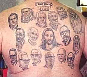 I was raised in the LDS Church (aka: The Church of Jesus Christ of Latter Day Saints). Though I am no longer a Mormon, I do have family members and friends who are and so news, photos, captions, etc., with the M-word in them usually catches my eye. While cruising around a tattoo gallery recently, THIS back piece tattoo caught my attention. At first, I thought it was Photoshopped or a joke, because I know the LDS Church's stance on ink, but after looking into it, I found that this large tattoo was on the back of Jack Armstrong, a long-time tattoo artist and collector who began his tattoo career in the 1920s and owned many tattoo shops throughout the years. Jack was a Mormon and wasn't joking when he had over a dozen Mormon prophets permanently inked onto his back. He told Don Terry in a New York Times article in 1998: