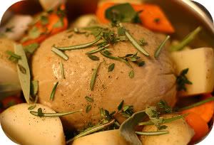 - Place roast in a tightly covered baking/casserole dish (or wrap with aluminum foil) with your veggies.