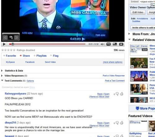 I just noticed a comment left on one of my YouTube videos regarding Miss California. It was SO incredible and shocking to SEE these two names (Palin/Prejean) together, and written in reference to a United States presedential election that I think I may be speechless; so I'm just going to post it for you to take a gander at yourself: